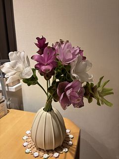 クルクマ気に入りすぎてリピートです。 今回はグリーンとホワイトが2本ずつ入っていて前回とはまた少し違う雰囲気でした。今回の方がお気に入りです! 届いた時は元気がなさそうに見えても水揚げしたらシャキッとパリッと元気になってくれます。 どんな色の組み合わせで届くかワクワクしながら待つ時間も楽しみのひとつです!