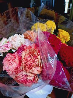 もこもこのオレンジやイエローのケイトウ、テラコッタやオレンジ、ベージュのカーネーションをたっぷり束ねました。一足早く、お部屋で秋を楽しむのはいかが?