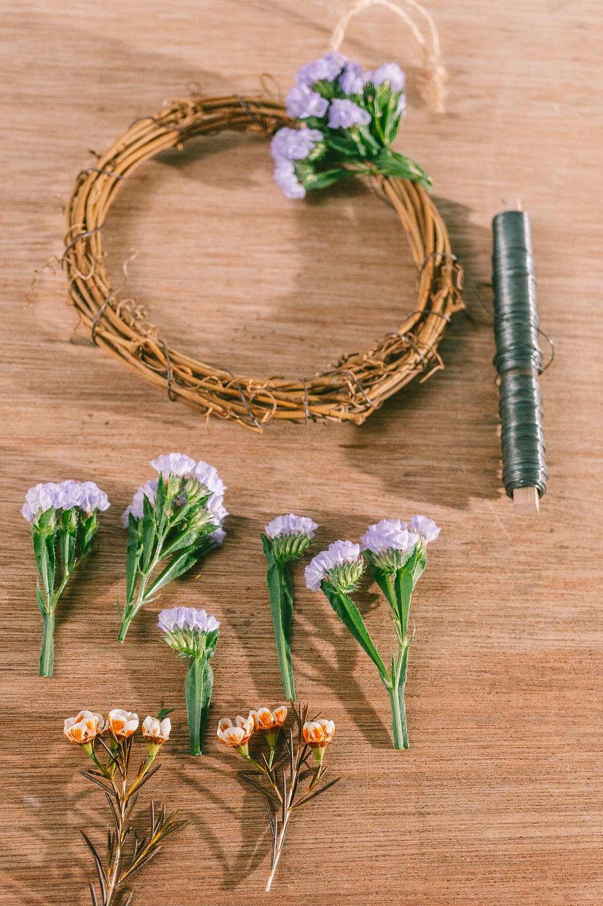 リース台に花材を沿わせながらワイヤーを巻き付けます