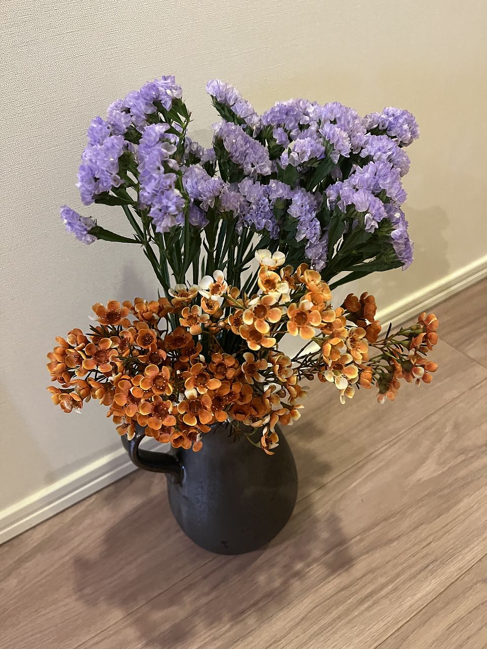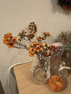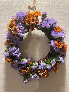 超・不器用なのでお花が正面をむいておらずお恥ずかしいですが、小一時間でそれなりに可愛くできました!商品ページのような紫もこもこリースにするには、もっとスターチスがいるような。。逆にオレンジのワックスフラワーはあまりましたので、花瓶に飾ってます。 この分が紫スターチスだとよかったかな、と思います。