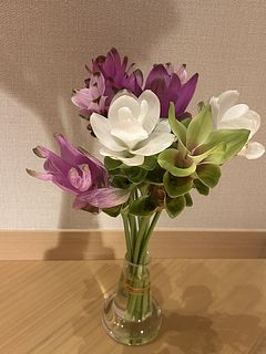熱帯アジア原産のクルクマは多湿な環境を好む植物なので、毎日霧吹きをしてあげて。上手にお世話ができると、苞の中からはかわいい花を咲かせることがあります。ぜひ長く楽しんで!