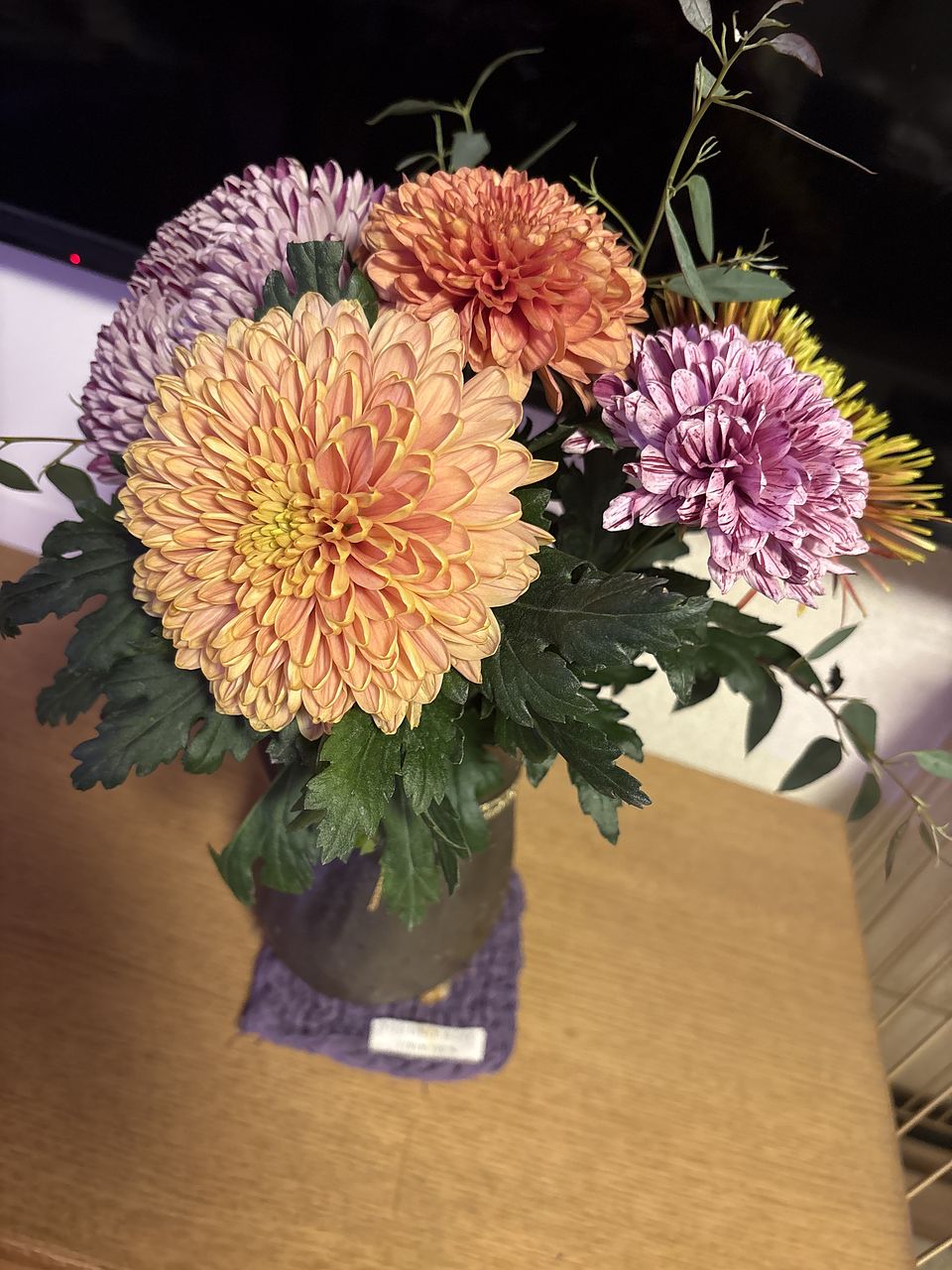 秋の味覚🍂 さつまいもとかぼちゃのようなほっこり秋色のマムを束ねました🍠🎃食欲の秋にぴったりのおいしそうなブーケ😋