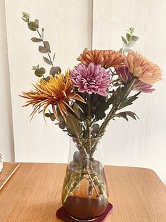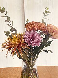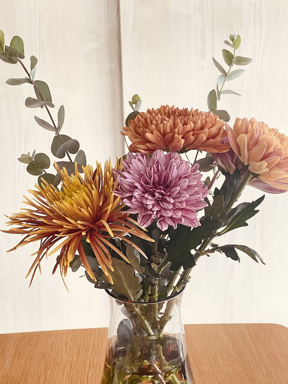 くすみカラーの大ぶりのマムが届きました。 少し気候と秋の方向に向いた中、ぴったりな秋色の趣きが気に入りました 明るいマムも好きですが、ザ菊よりな今回マムも素敵です! 花火のような花弁のマムもありました