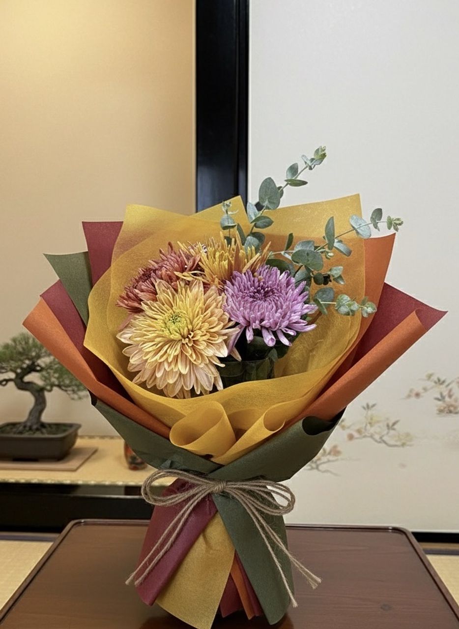 重陽の節句になっても、今年は庭の菊のお花は咲かないし、お花屋さんにもあまり見ないしと思っていたので、こちらで購入しました。まさに秋色のかわいらしいマムが届き、大満足です💕