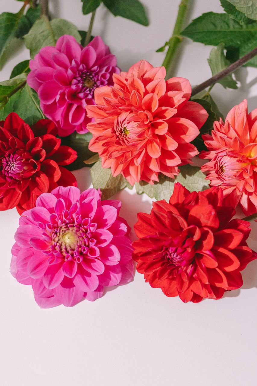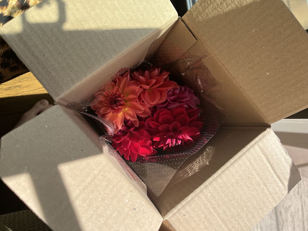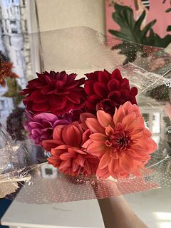 今回はダリア「エタニティシャイン」「エタニティルージュ」「オレンジストーン」などピンク・赤・オレンジのダリアを6本お届けします。エタニティシリーズは日持ちが大変優れている品種です!ぜひお試しを✨