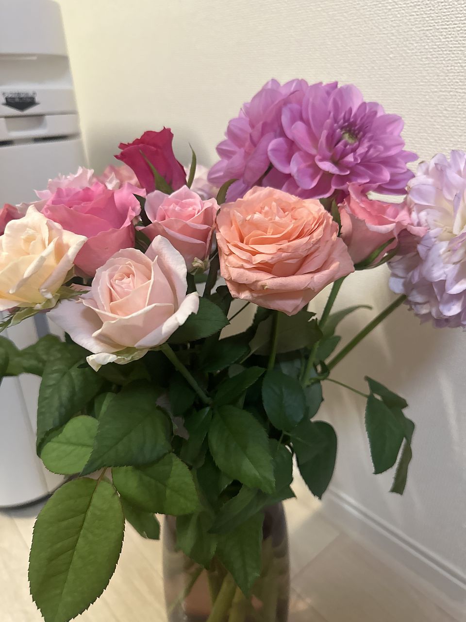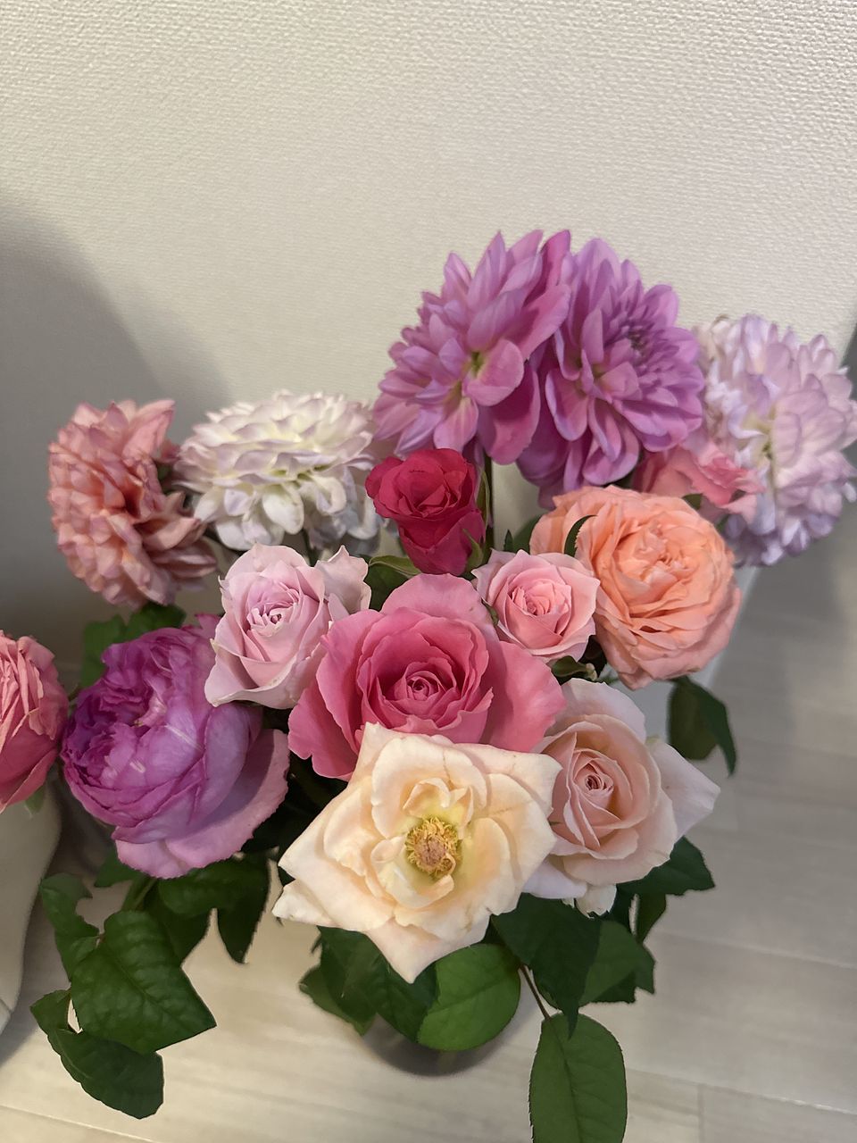 今が旬のデコラ咲きダリアと香るバラのロマンチックなブーケをお届けします💖お部屋がふんわり幸せ色に☺️