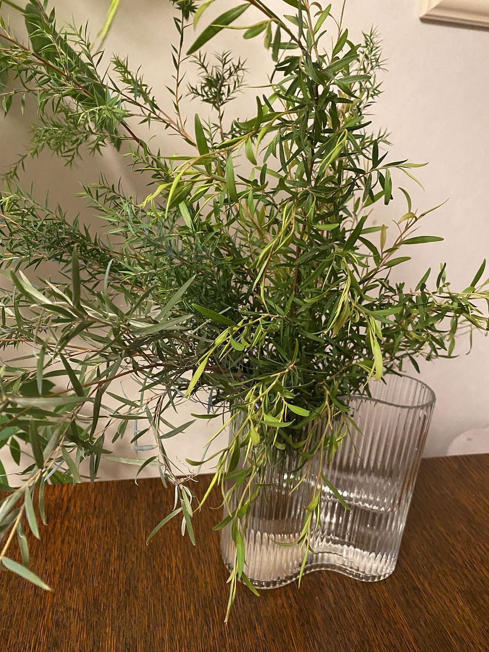 ふわふわのティーツリーが届きました! 葉っぱを少し触ると独特の爽やかな香りがして、この夏の暑さを乗り越えられそうです。 写真程のボリュームは無かったですが、こちらのファゴットのフラワーベースにもバランス良く飾る事が出来ました! 欲を言えば…もう少し長いと嬉しいです!