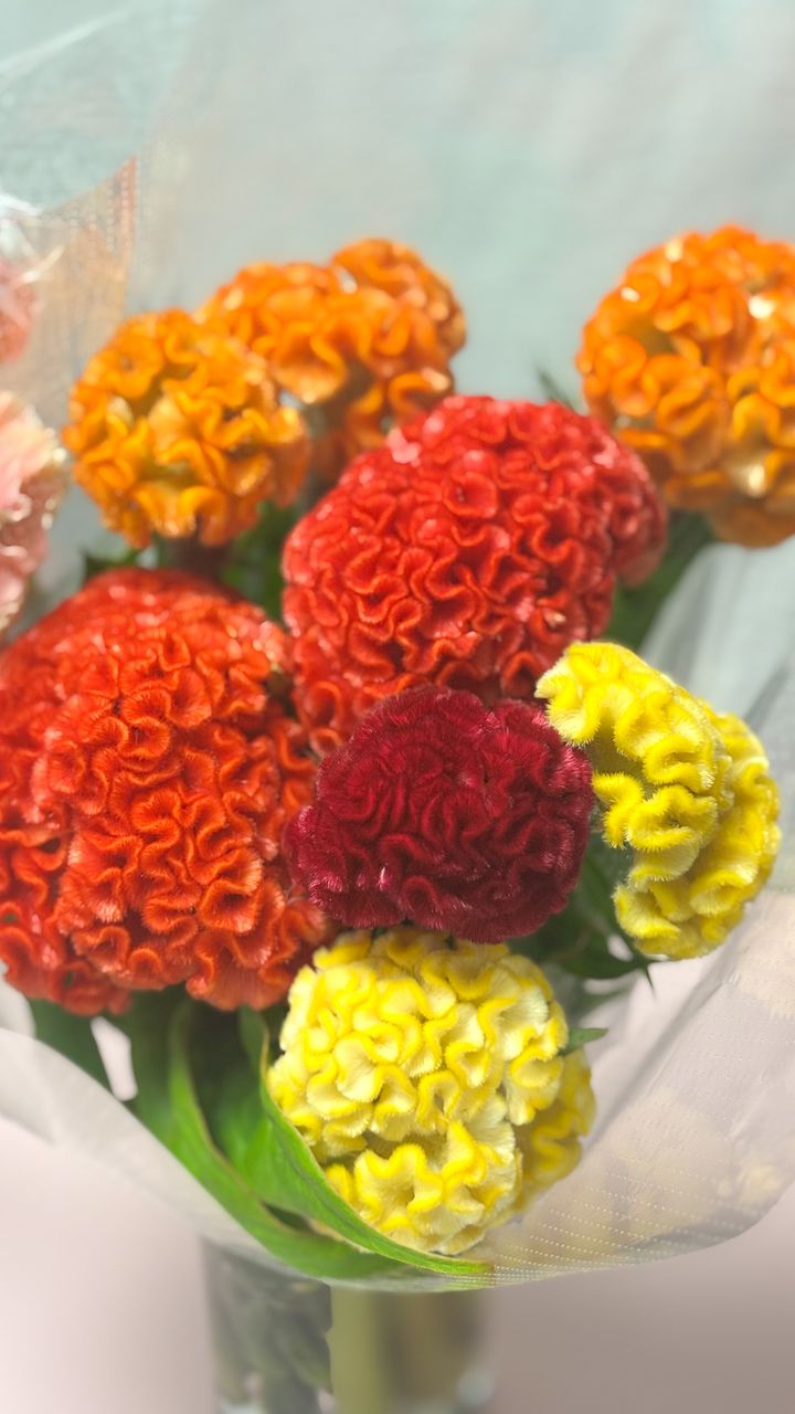 今回は秋に大人気の花材「ケイトウ」とこっくり秋カラーの「カーネーション」を2束セットでお届けします🧶🍁🐿️