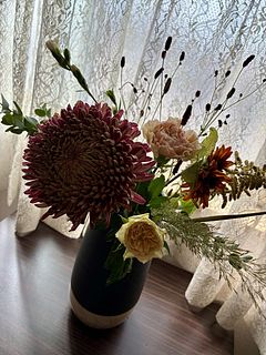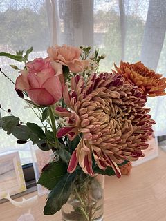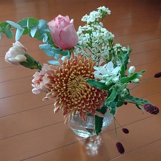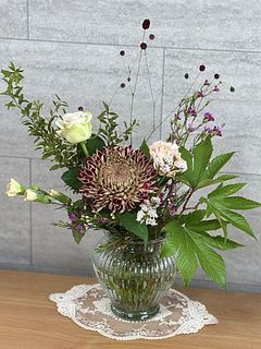 秋満載の素敵な組み合わせの花束でした、包みを開ける時から菊の香りが漂ってきて感激でした、色合いも自分からは頼まないしっとりとした落ち着きのある和室に似合いそうです、ときめく提案をありがとうございました。