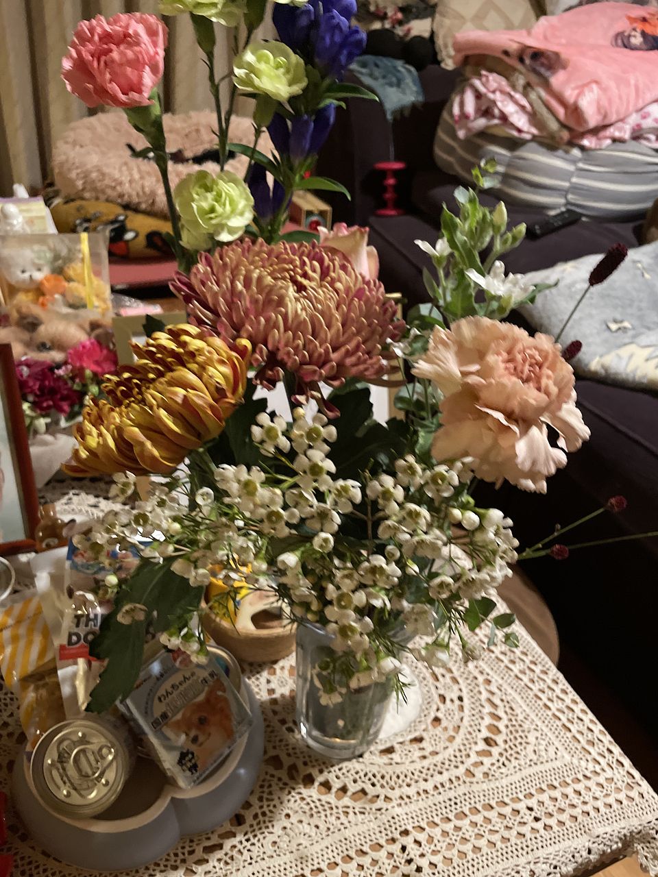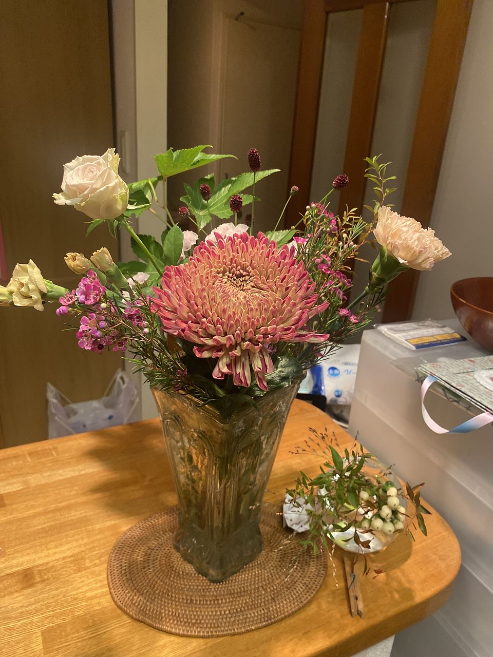 持っている花瓶に対しては 大きな菊の花もあり少し丈が短い感もありますが、綺麗な秋のお花が活けられました。もうすぐ自分の誕生日なので頼みました。