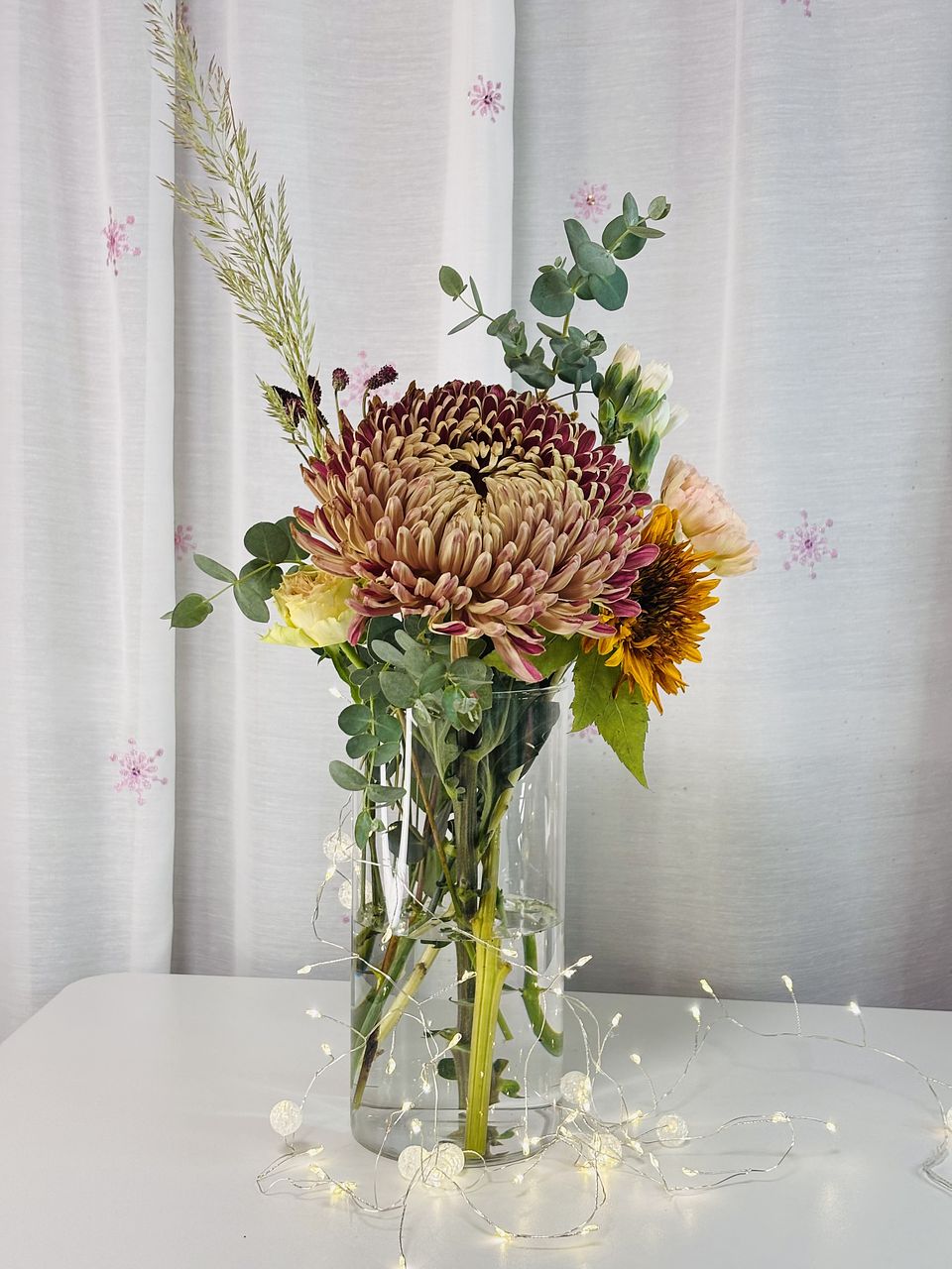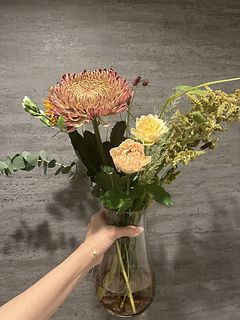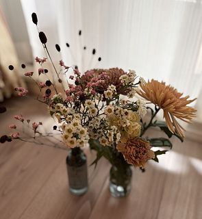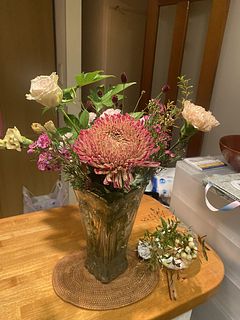 枝物と大ぶりな菊をバランス良く挿すのが難しく2つに分けました、いい感じです😊✨お花のボリュームは寂しいですが小花がたくさんで可愛らしく満足です!