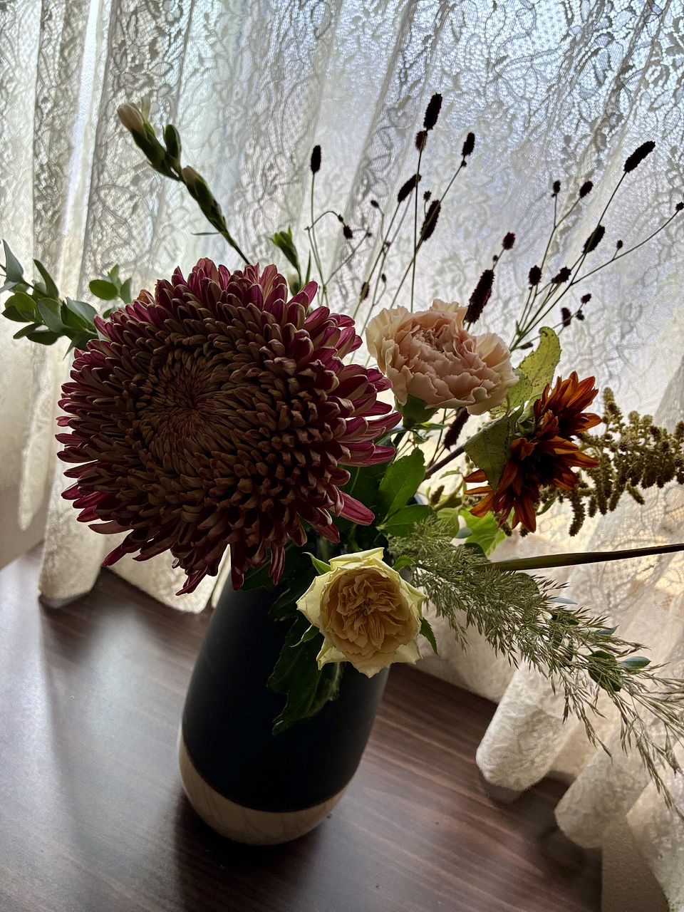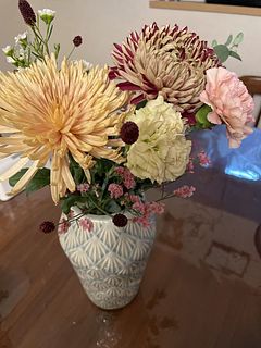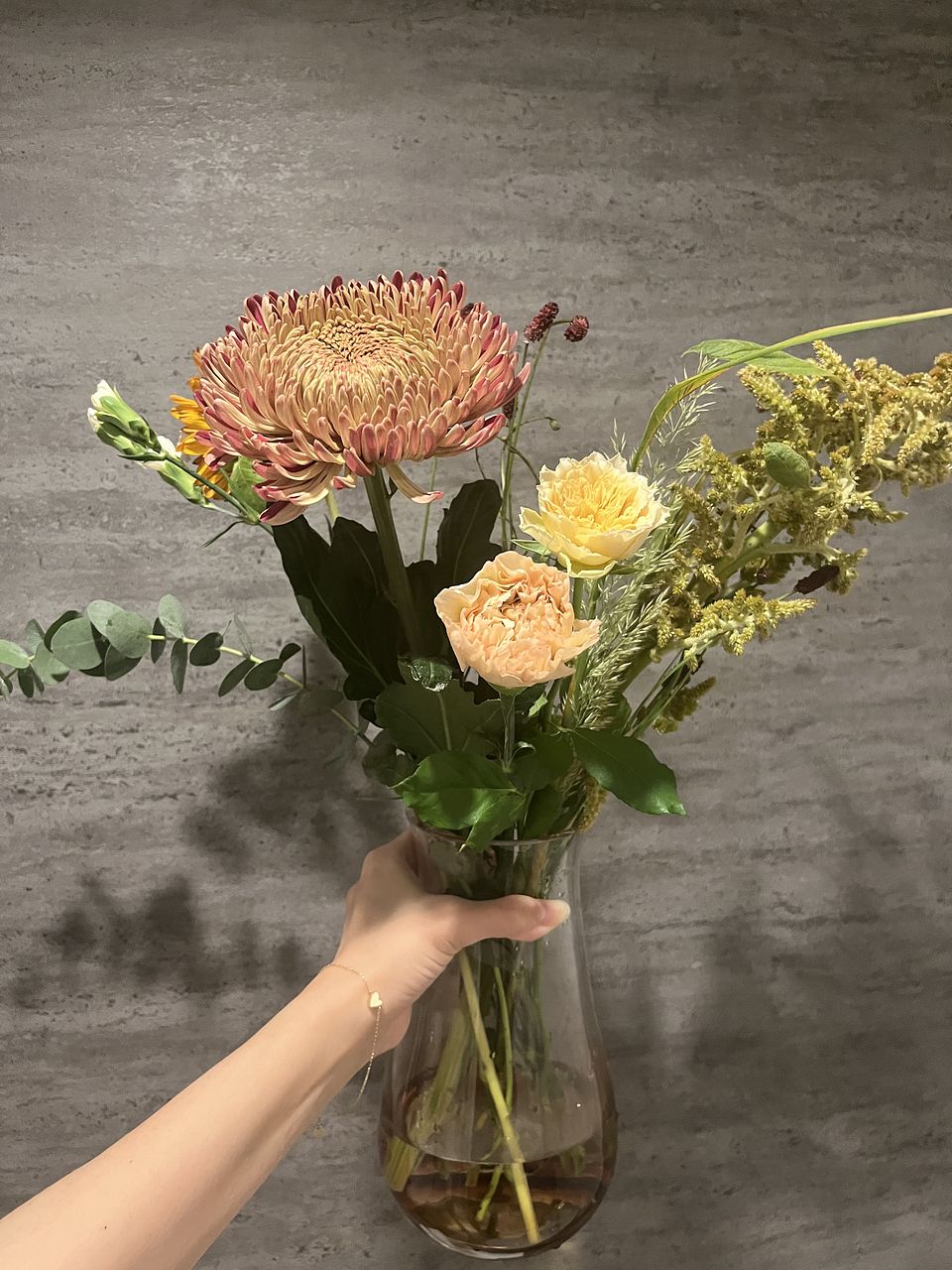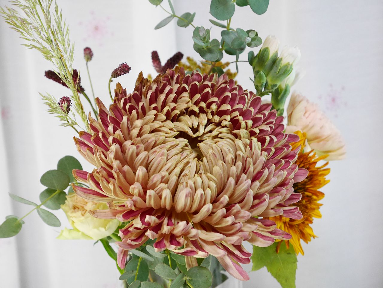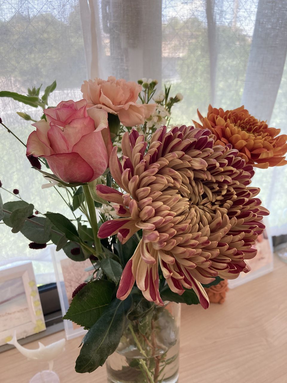 一気に秋色になり綺麗なお花でした。 菊を飾るって縁起の悪いイメージがしてましたが、 この花束で、初めてマムのお花の素敵さを感じています。開いてきたらどんなふうに変化するのか楽したみです。