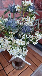 ワックスフラワーやエリンジウムを組み合わせて。ドライに向いてるお花をセレクトしています。ユーカリの香りも楽しんで! ワックスフラワーは葉っぱをこするととっても良い香り。
