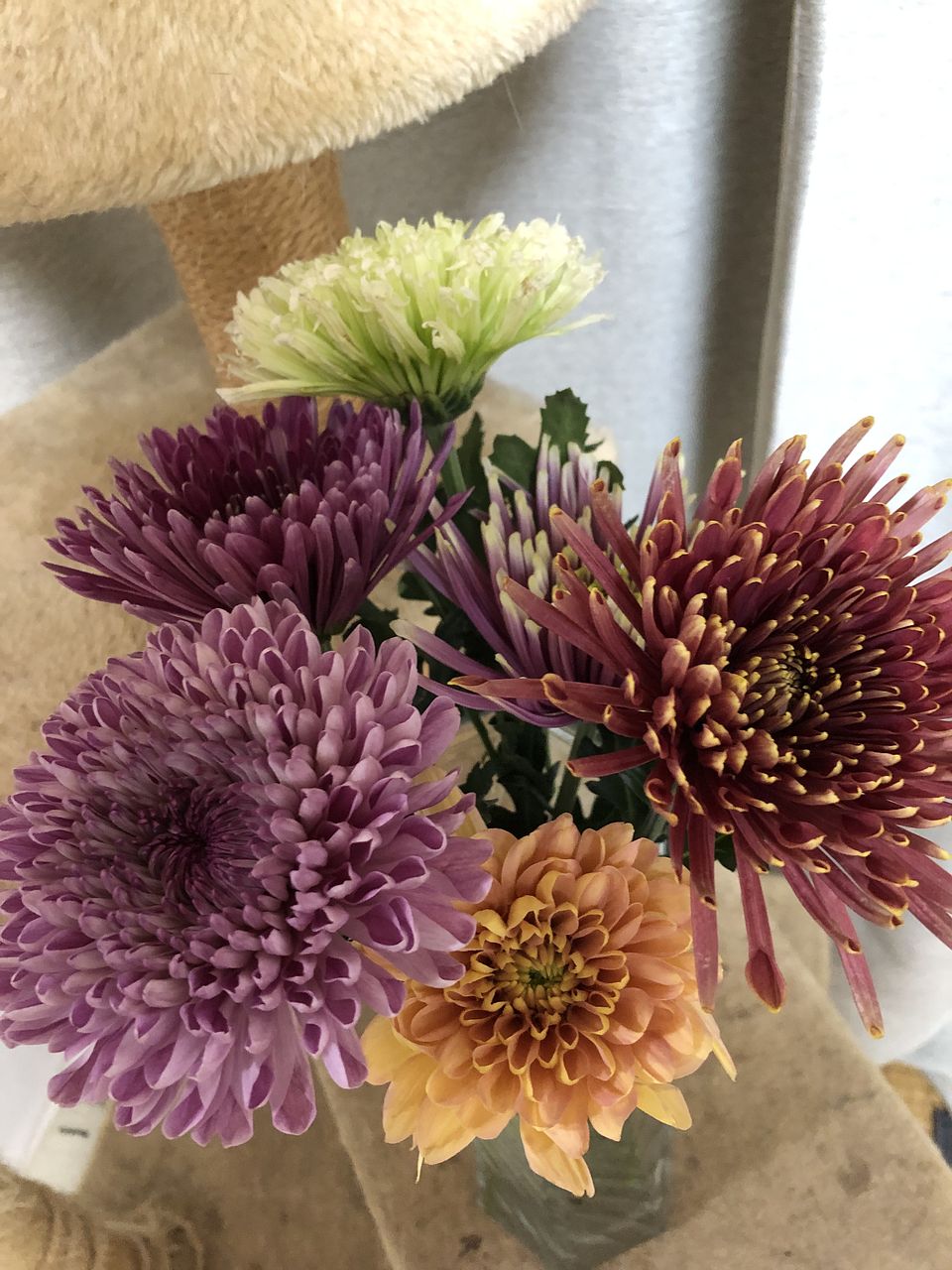 1本ずつカバーが付いていたので、外すとポンっと開いて大輪のマムがボリュームいっぱいです。こんなに色々な種類の物は見たことないので新鮮です。