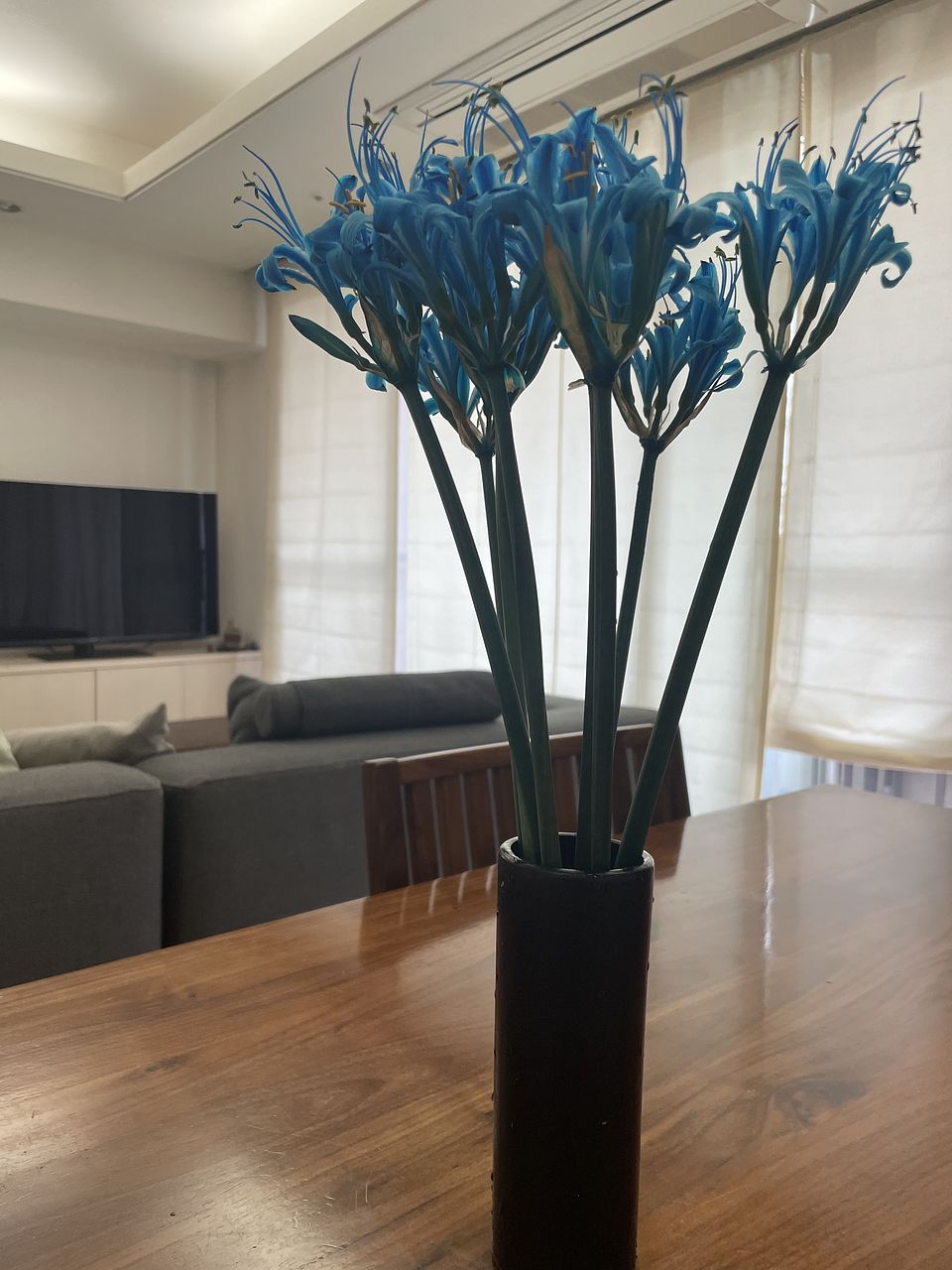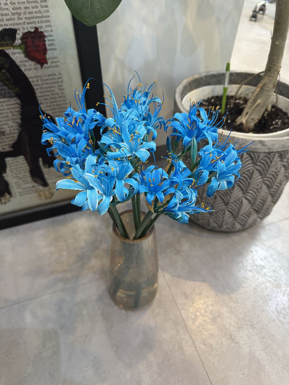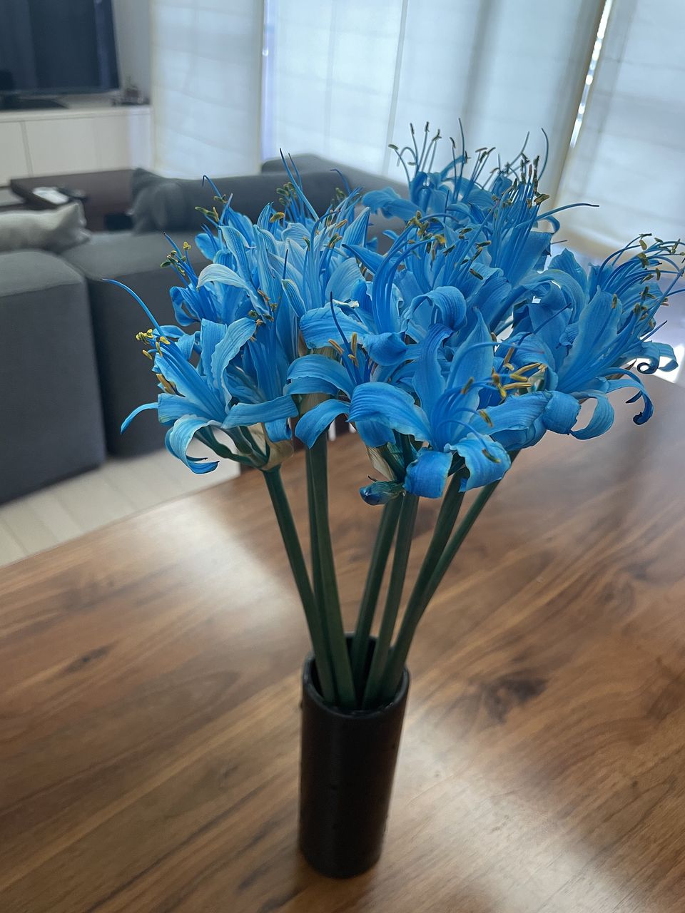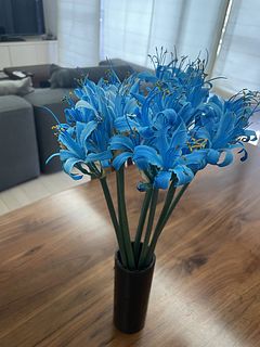 写真はもっと薄いブルーで、ベースの白も残っているようなイメージでしたが、届いたのはいかにも人工的なきつい青…花びらも彼岸花ぽくないというか…写真とはかなり違うと思いました。