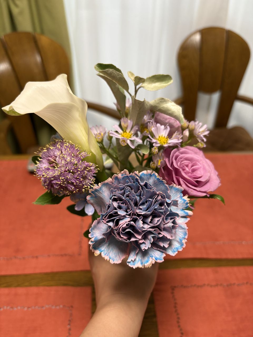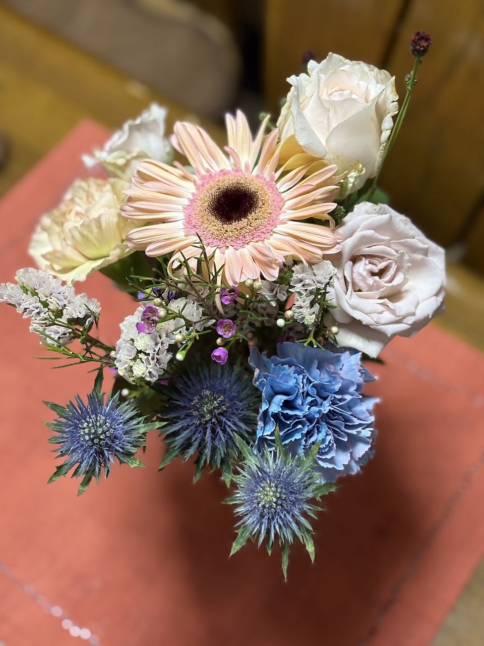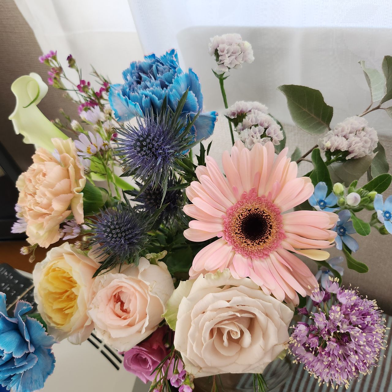 娘の誕生日プレゼントに購入。 ブルーのカーネーションやニゲラ🩵 淡い色の薔薇もニュアンスカラーで可愛い🩷 先日購入した、おまかせリゾートグリーンがまだ元気で一緒に活けてみました。 素敵なアレンジになりましたよ♪ 花瓶も2つともお気に入りです!