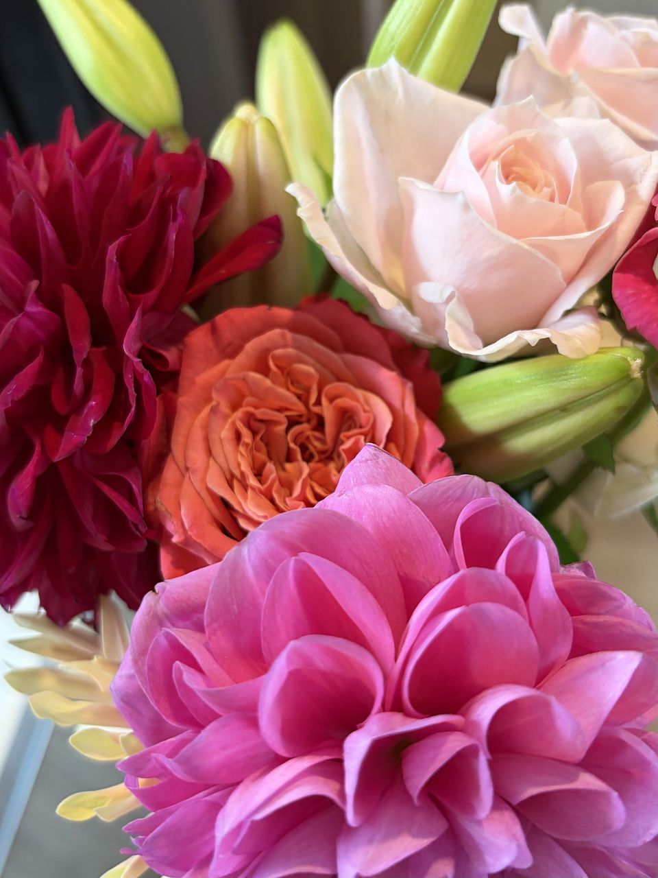 ダリアは満開で存在感あり、ユリやバラはこれからの開花が楽しみです、今回初めてダリアを購入しましたが素敵なお花で魅了されました、納得いく内容の花束をありがとうございました。