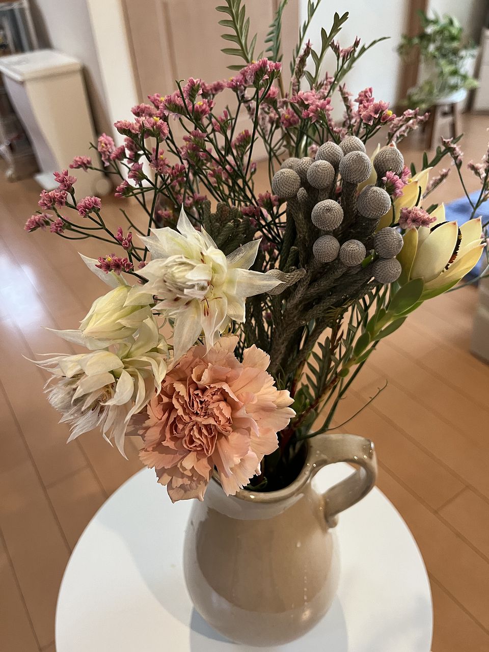 今回も素敵でした♡ センスよく組み合わせたお花が届くので 花瓶にバサっと入れるだけで華やかです! 数日、生で楽しんでからスワッグ にします。