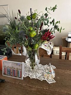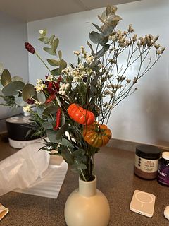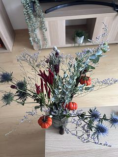 はじめて頼みましたが、グリーンや霞草を別の花瓶にも飾れるほどボリュームがありました! ミニかぼちゃの実の付き方で全体のイメージが少し変わるかなと思います🎃大きめの実が枝の下のほうに付いていたので、枝から切って、娘とジャックオーランタンの顔を書いて別で飾りました!それも可愛いくて大満足です!