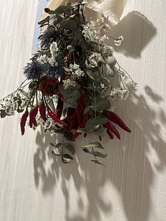 白と赤、青、黄色の組み合わせがワイルドフラワーの雰囲気と合っててとってもかわいいです。 花瓶に合わせてカットして飾りました。スワッグにもとても似合いそう💓