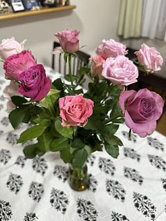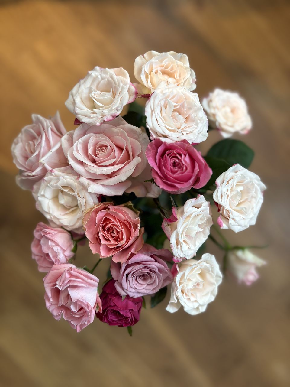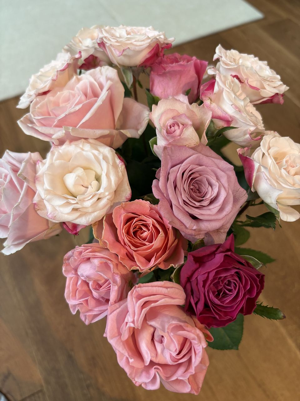 いろいろなピンクのバラが混じってとてもきれいです。出かける直前に届いたのでとりあえず水切り、水あげして、3時間くらいして帰ってきたら、開いたのもありましたがつぼみのままのものあり、長く楽しめそうです。
