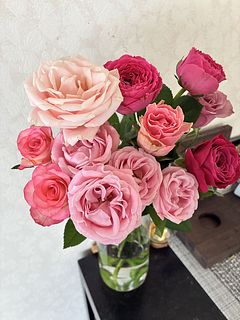 薄いピンクから濃いめのローズカラーまで、花びらの形も色々でバラエティーに飛んだブーケです。一輪咲、スプレーバラどちらも入っています。 箱を開けた瞬間、うれしくなる組み合わせで笑顔になりました。