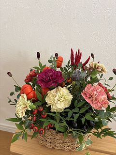 レッドやテラコッタ、オレンジ、ベージュなど秋色のカーネーションを7〜8本、実ものや秋の草花、グリーンを合わせて7〜8本ほど、合計14〜15本お届けします。