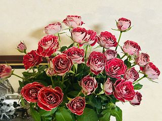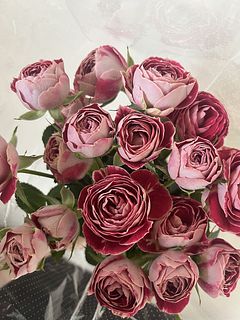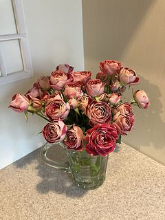 初めてみるSPバラで、ボリューミーで少し香りもあって美しくとても満足しています。8本に28個もの花付きでした。花色が独特で、開く過程での変化も楽しみです。