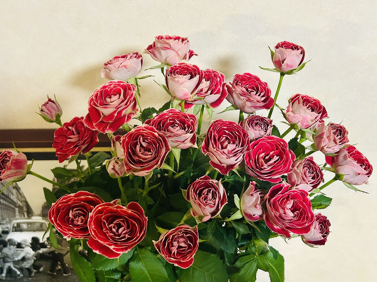 ボリュームもあり 花びらの裏は白 内側は赤 珍しいローズで 見る人見る人が注目します とてもステキなお花でステキです