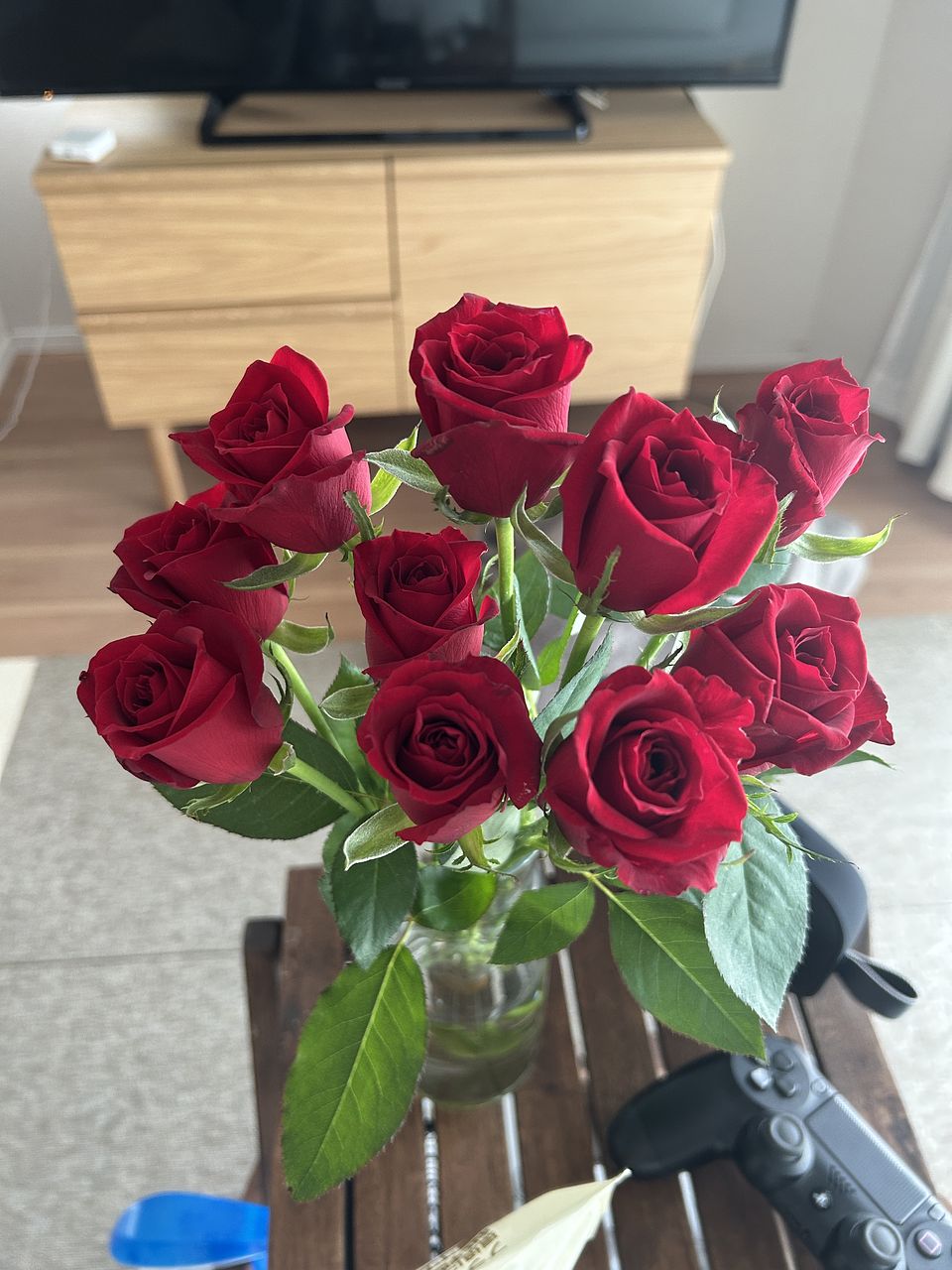 素敵な色の薔薇です。鮮度も良くて、赤い薔薇ってやっぱり素敵だなと思います。長く楽しめるように頑張ります。