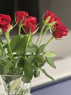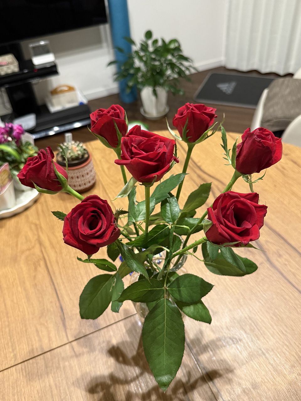 王道の真紅のバラ🌹、蕾のじょうたいで届き、これから少しずつ咲いていくのが、とても楽しみです。 10本入っていたので、7本と3本に分けて、2か所に飾れました。このバラは香りはほとんどしないです。