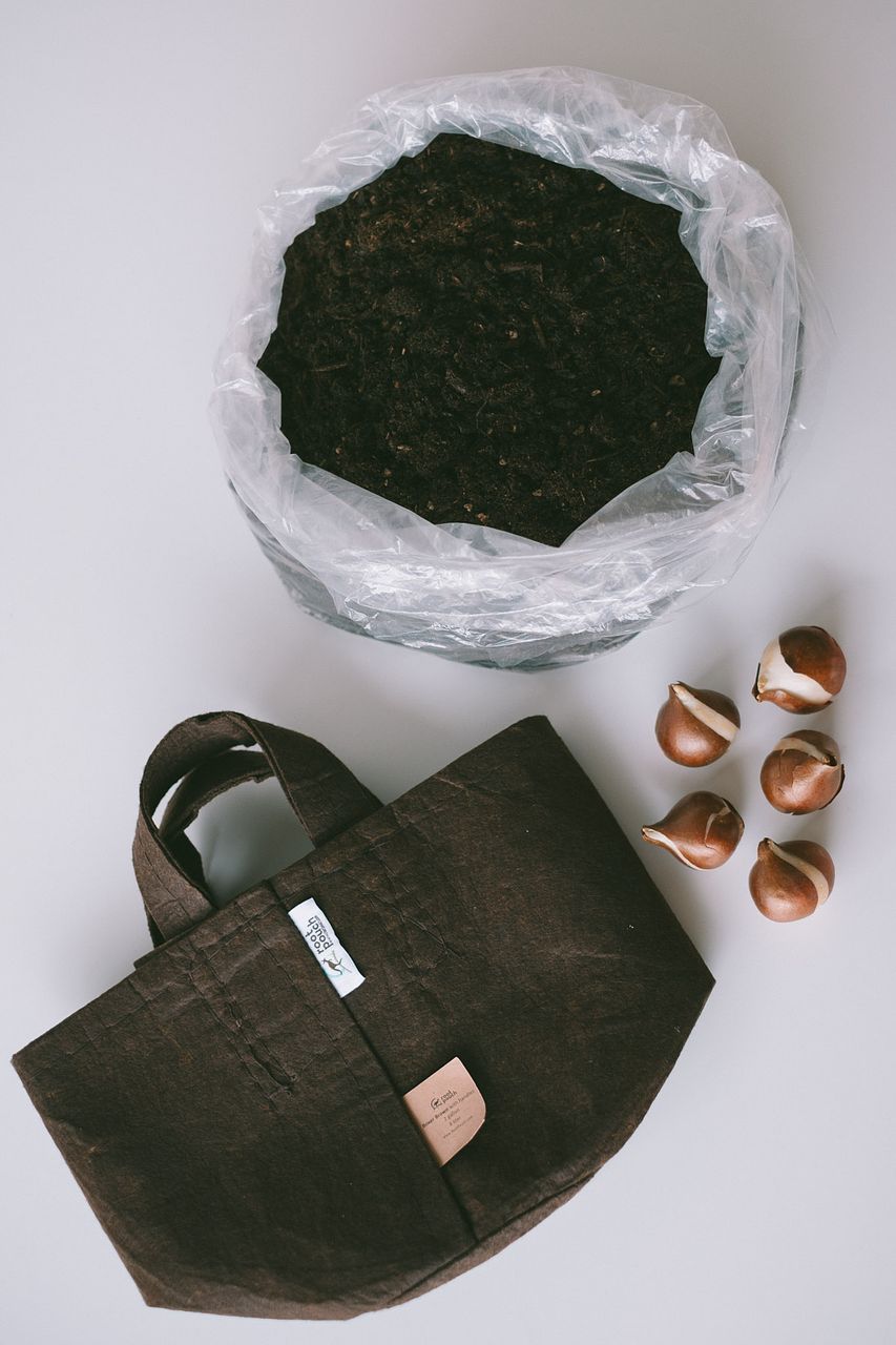 培養土は球根栽培用に配合されたものなので、届いたらそのまま鉢に入れるだけで準備OK。鉢はリサイクル素材から作られた不織布製。通気性や透水性がよく、チューリップの栽培にも適しています。軽量で持ち手がついているので持ち運びもらくらく。ベランダでの栽培にも適しています。