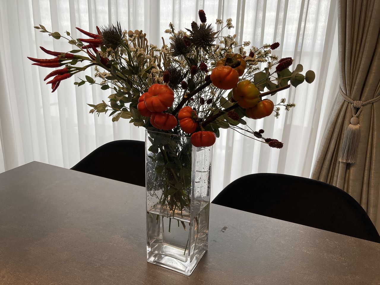 ボリュームたっぷりで、とてもかわいいです。 カボチャが重いからか、四粒付いてる枝が折れていました。でも、折れていたのも花瓶に引っ掛けて飾ってみました。