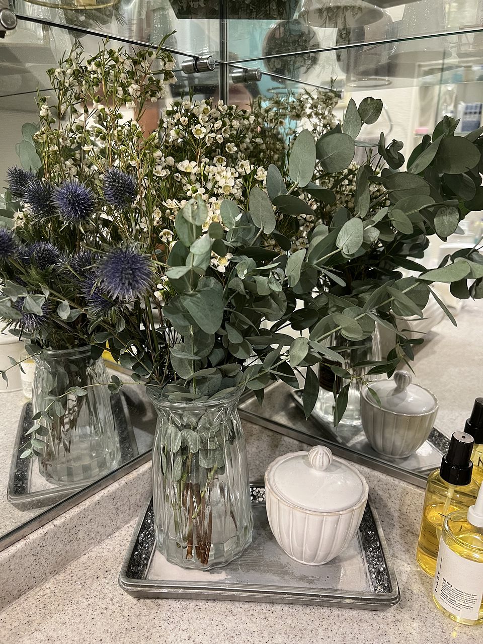 ワックスフラワーやエリンジウムを組み合わせて。ドライに向いてるお花をセレクトしています。ユーカリの香りも楽しんで! ワックスフラワーは葉っぱをこするととっても良い香り。