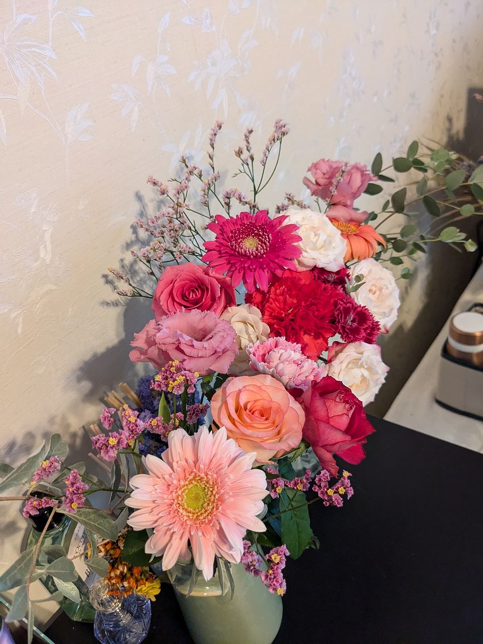 とてもボリュームがあり、玄関が華やかになりました。 帰宅のたびに気持ちが上がります🥰⤴️ わが町の小さな花屋だとどうしても種類が限られますがこちらは葉ものも花も数種類混ざっていたのでよかったです💖 冷蔵庫で保管された花はすぐ咲いて終わる感じでしたがこちらのは新鮮なので持ちも良かったです。 また利用したいと思います。
