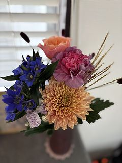 深みのある青と紫の花、落ち着いたオレンジが重なり合い、秋が深まる「神無月」の空気を感じさせるブーケです。