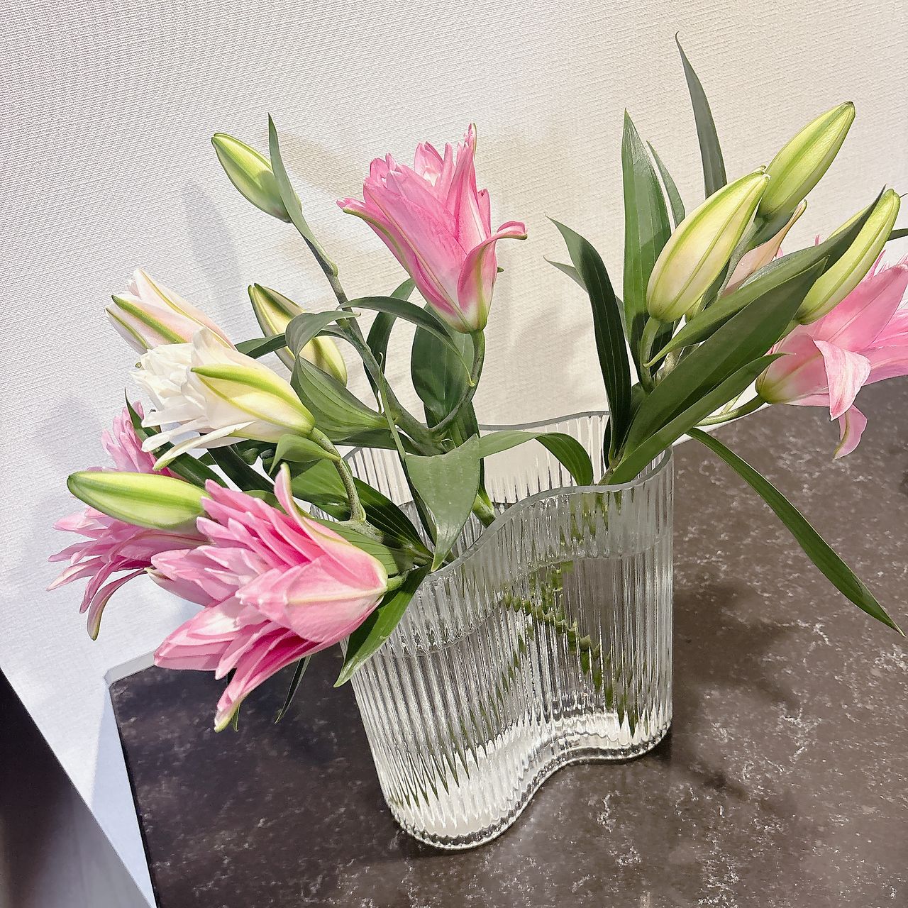 八重咲がとっても華やかでかわいいです🥰🥰 届いてすぐの水揚げ中→水揚げ終了後の写真です。 3本ですがすごいボリュームなので、ウェーブの花器を買っておいてよかったです!