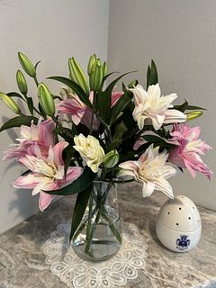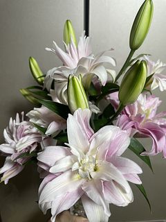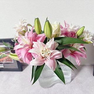 咲きはじめとつぼみが程よく付いていて、素敵です。ユリが好きな方にはとてもおすすめなお花です。いつも届いたお花はリビングに飾りますが、思ったより百合独特の香りがして、私には少しきつく感じるので、玄関に飾り、愛でています。
