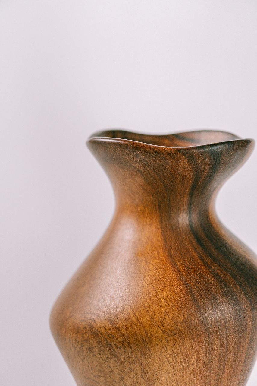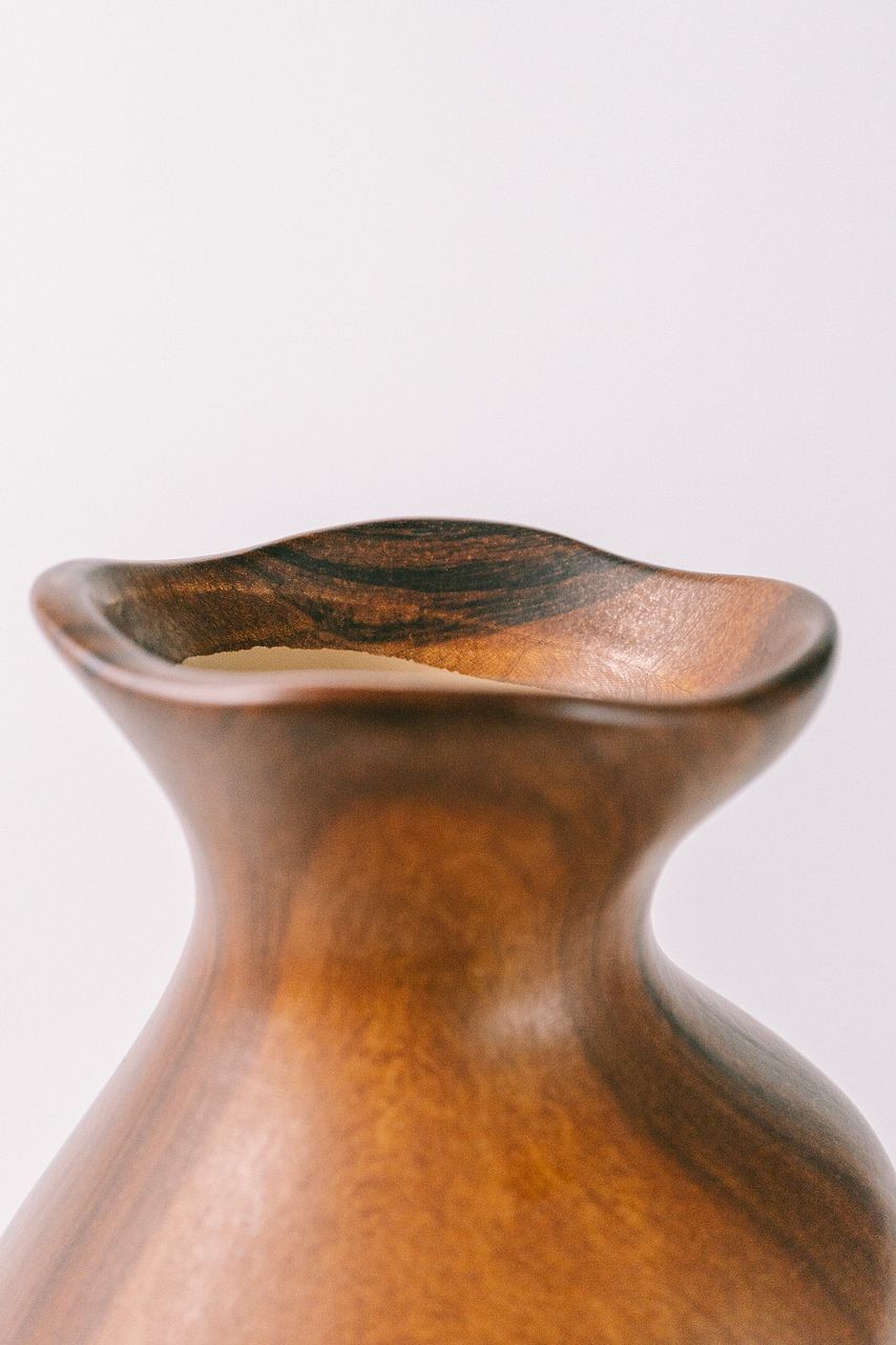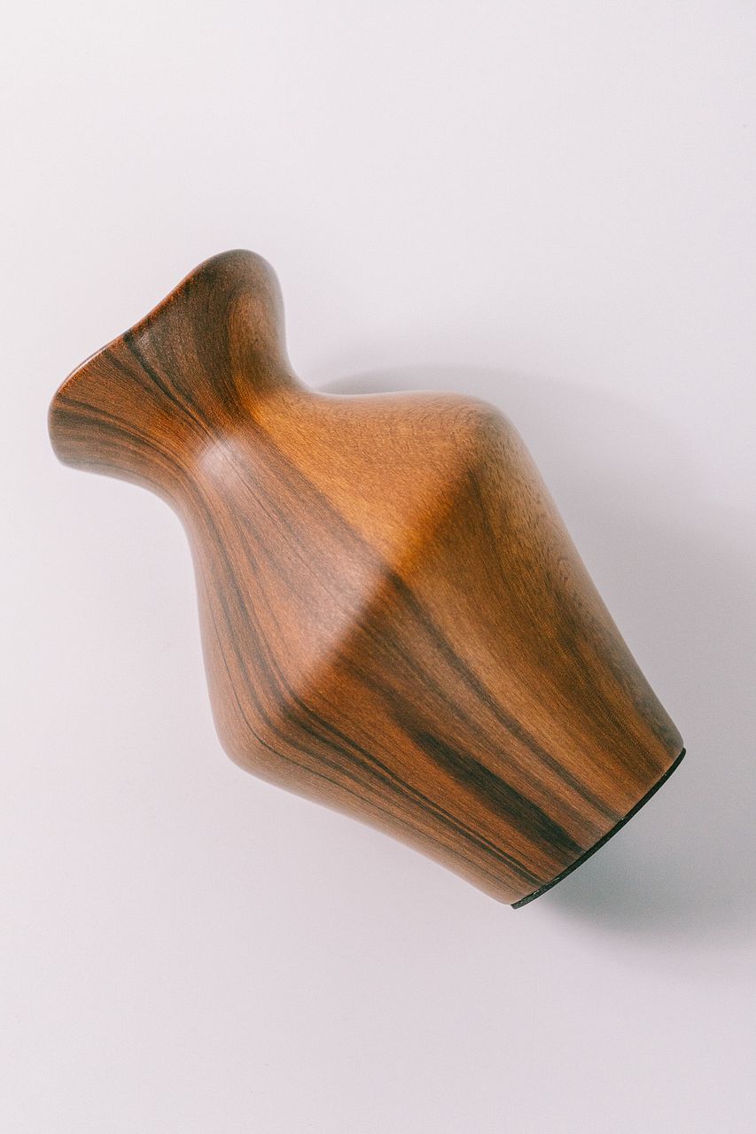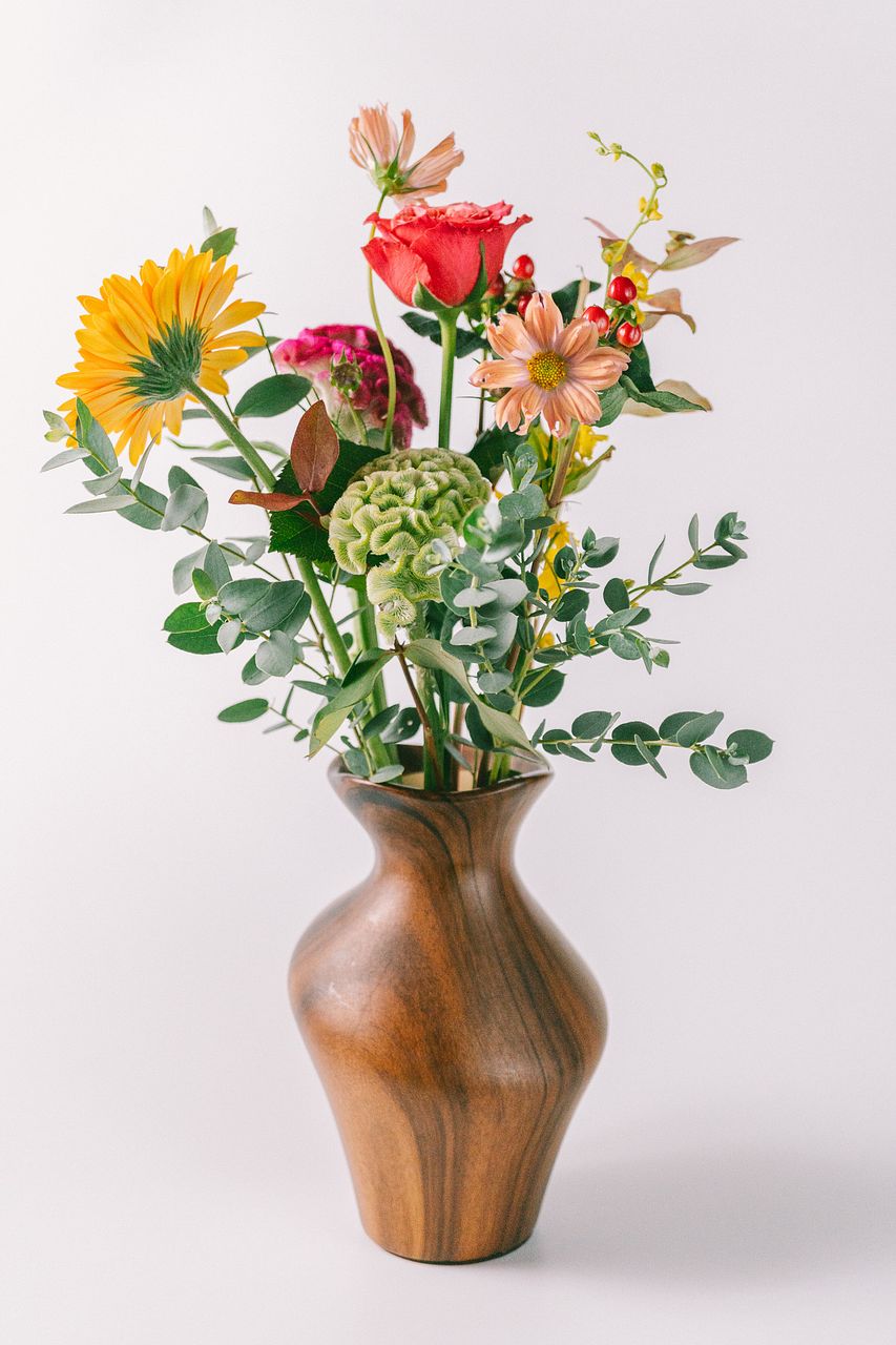 手に取るとすべらかで、ひんやりとした質感。落ち着いた色合いと柔らかな曲線が、花をよりいっそう引き立てます。木目調のナチュラルな雰囲気なので、和洋どちらの空間にもすっとなじむのも魅力。
