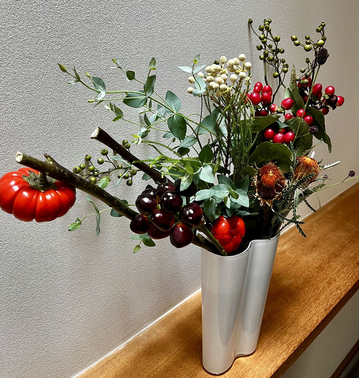 つやつやの赤い「ヒペリカム」つぶつぶがかわいい「のばらの実」、艶のある不思議なとうがらし「コニカルブラック」、かぼちゃのような「ソラナムパンプキン」、ごろごろかわいいネイティブフラワーなど。 秋の彩りをお部屋に飾ってみて😉