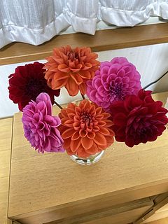 今回はダリア「エタニティシャイン」「エタニティルージュ」「オレンジストーン」などピンク・赤・オレンジのダリアを6本お届けします。エタニティシリーズは日持ちが大変優れている品種です!ぜひお試しを✨