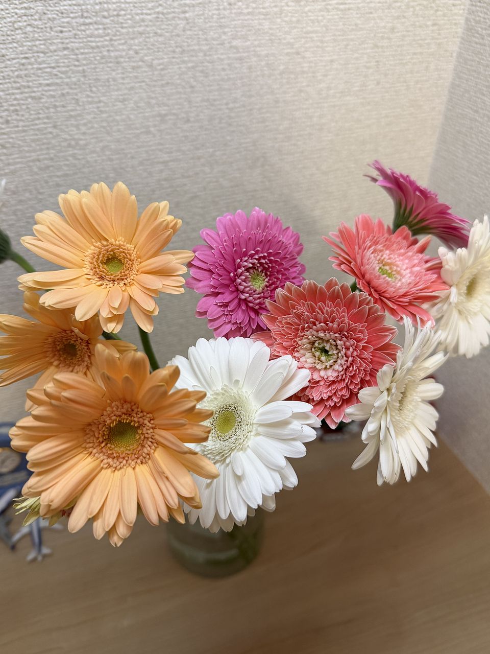アプリコットピンクやコーラルピンク、ホワイトピンクなどニュアンスカラーのガーベラをギュッと束ねました🍑ころんとした咲き方が最高にキュート🥰