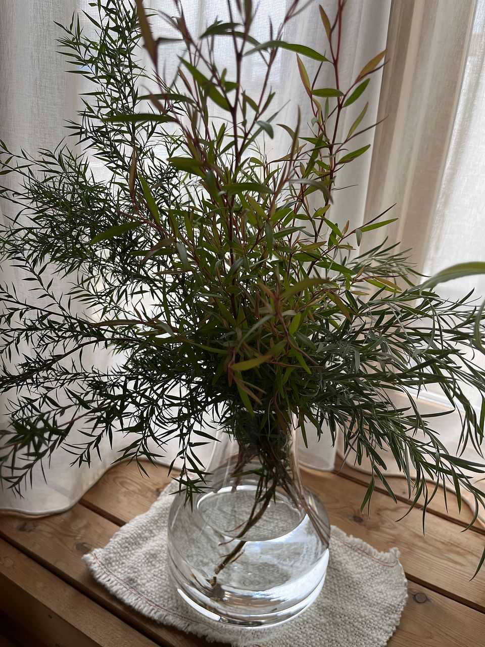 ティーツリーの強力な浄化力も相まって、部屋がとってもクリーンな雰囲気になりました! ひと枝はサイドテーブルに、残りはダイニングにバサっと飾りました。いい感じ!