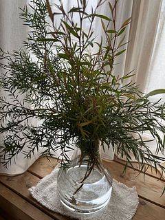 ふわふわのティーツリーが届きました! 葉っぱを少し触ると独特の爽やかな香りがして、この夏の暑さを乗り越えられそうです。 写真程のボリュームは無かったですが、こちらのファゴットのフラワーベースにもバランス良く飾る事が出来ました! 欲を言えば…もう少し長いと嬉しいです!