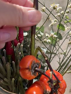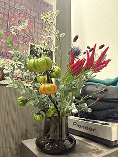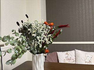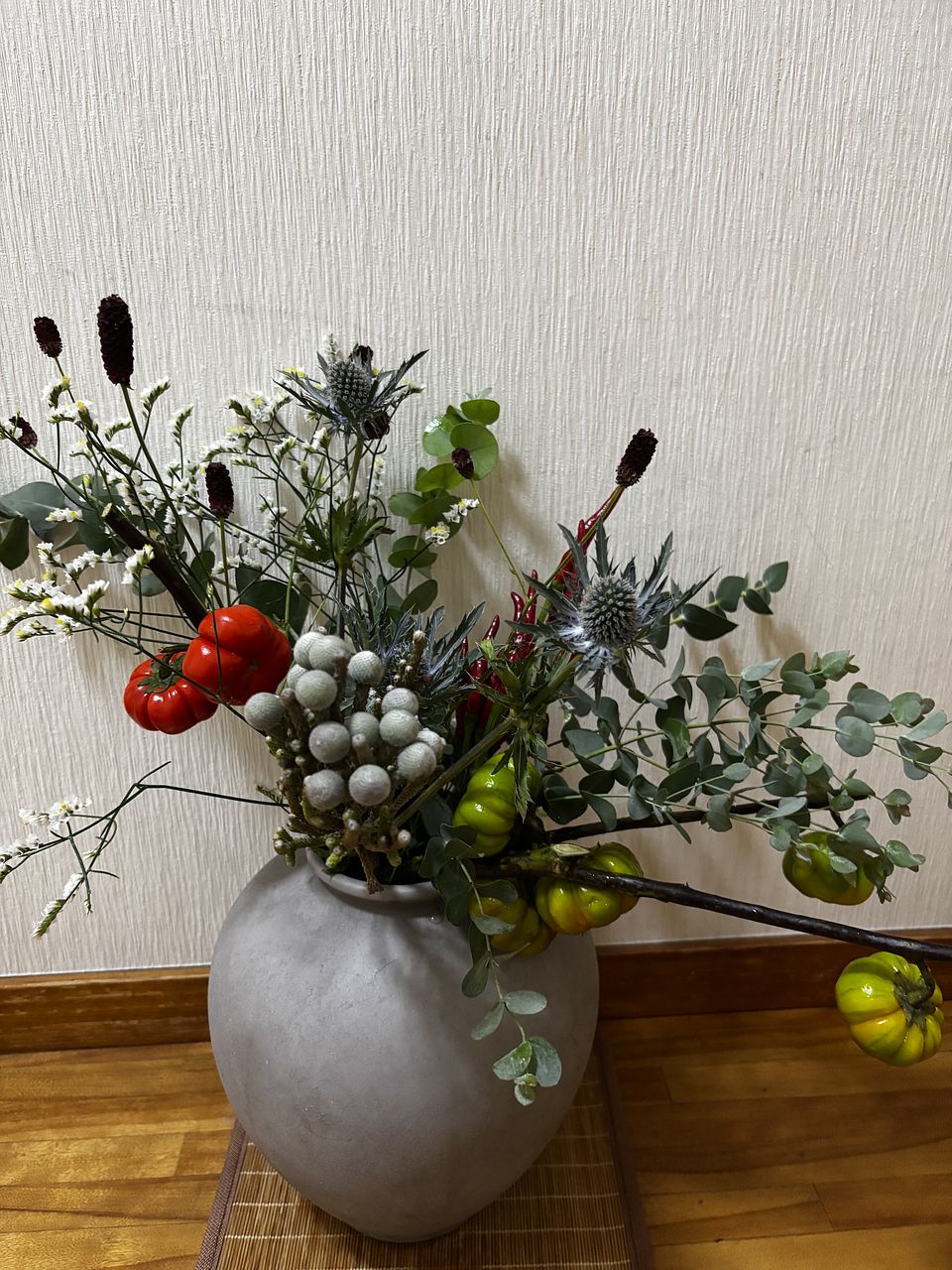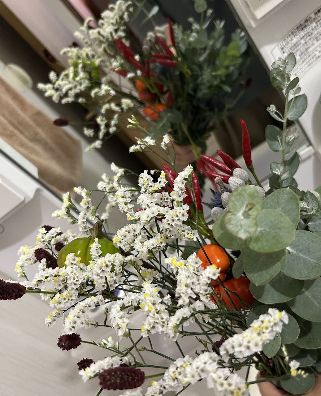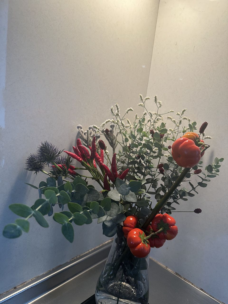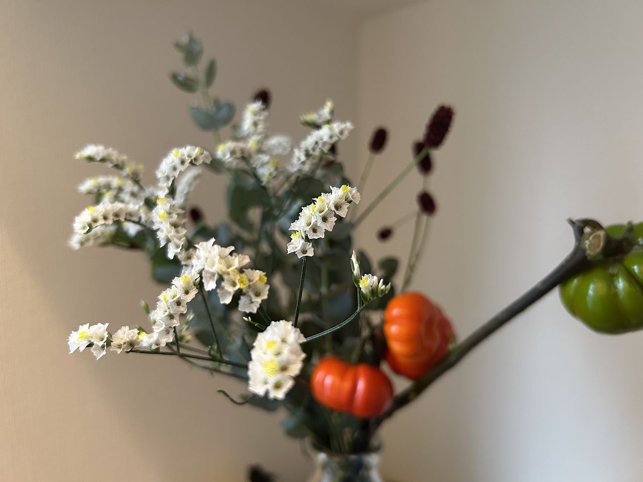オレンジの実のうちの1つが届いた時点で柔らかくなっており、飾って半日後に中から1センチほどのイモ虫?幼虫?が出てきました…!🐛調べましたが何の虫かは分からず。柔らかくなっていた実は取り除きました。別のオレンジの実も1つ食べられていましたが、まだ固めなので取り除かず残してあります。