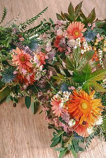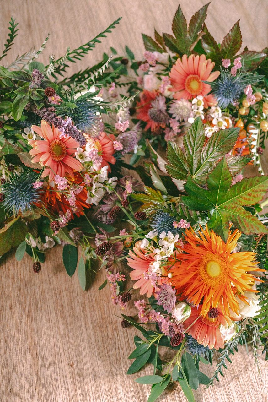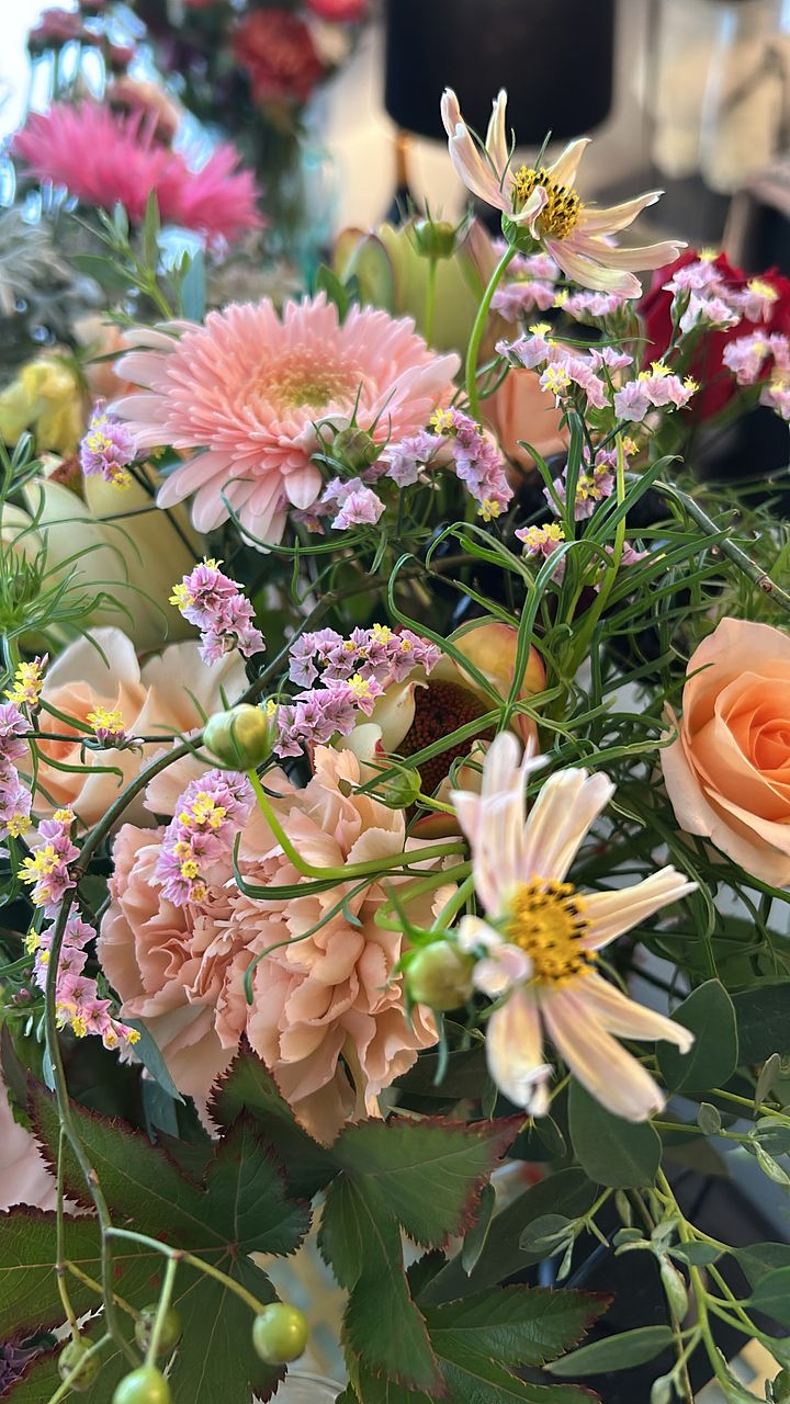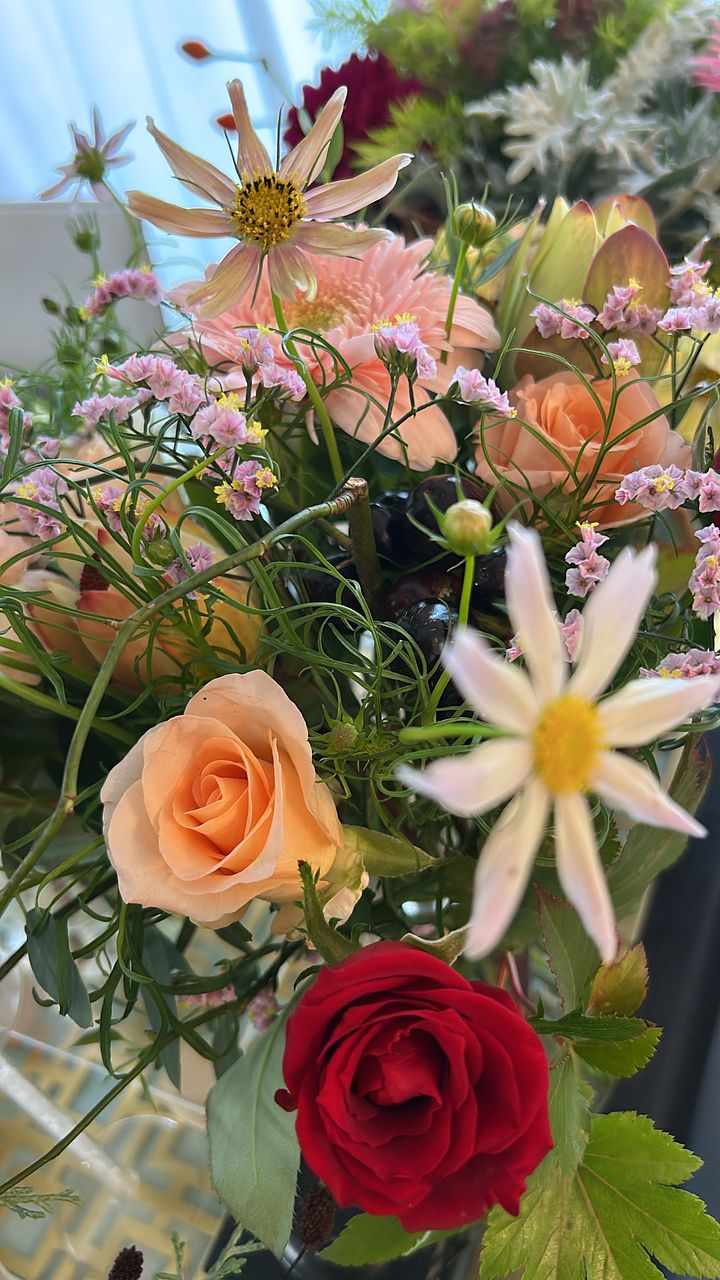 秋の草花を贅沢に束ねた、季節感あふれるブーケ。色づいた葉ややさしいコスモス、オレンジの花々が重なり合い、秋の情景をそのまま束ねたような色合いに🍂