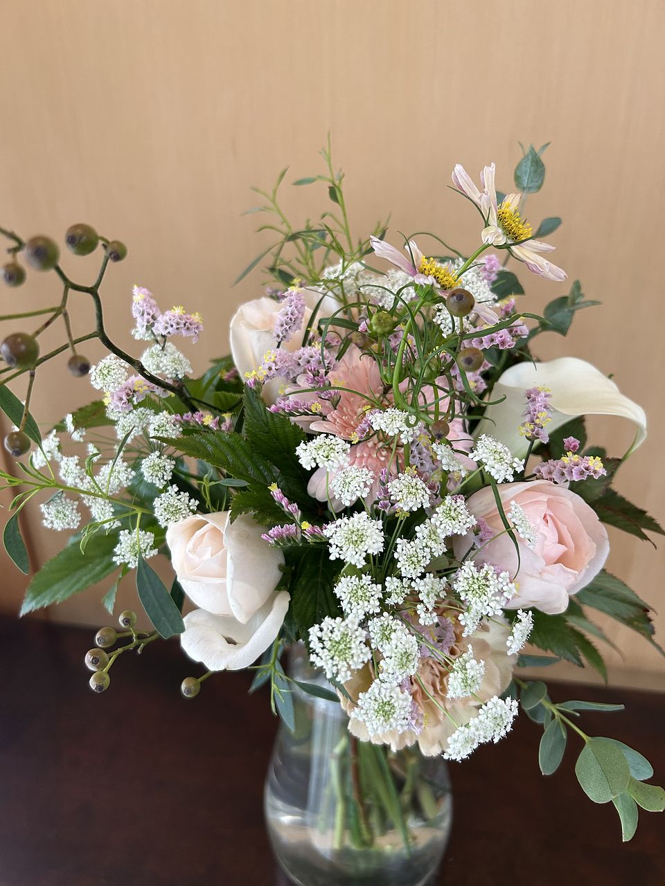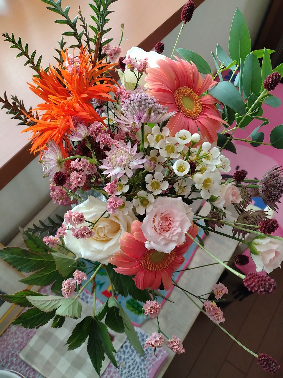 優しい色合いのお花が届きました。仕事の疲れも吹き飛ぶ美しさ🌸お花は人を元気にしますね!
