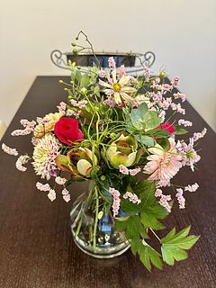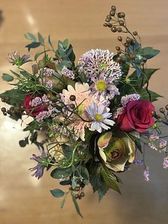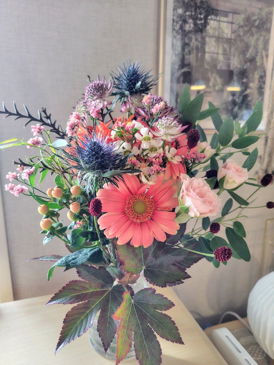 ピンク系のブーケ💐が届きました。葉っぱの香りが漂って、知らないお花もチラホラ。秋らしいブーケで満足しています。コスモスも花びらが多くて、この辺りでは見ないものでした。ぎゅっとまとまっていましたが、花瓶のサイズに合わなかったので、紐は外して活けさせて頂きました。こまめにお水を替えてあげて、長持ちすると良いなぁと思っています。