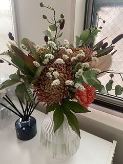 オレンジ系ですが大人シックな色合いでとても素敵なブーケが届きました。小花やグリーンもたっぷりで本当に素敵です。また購入したいと思います😊