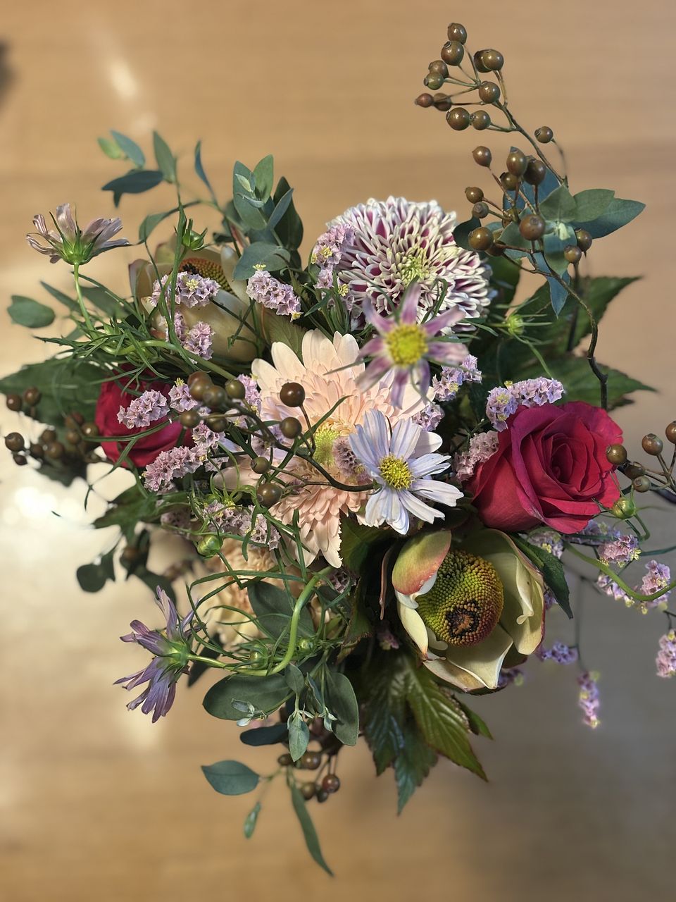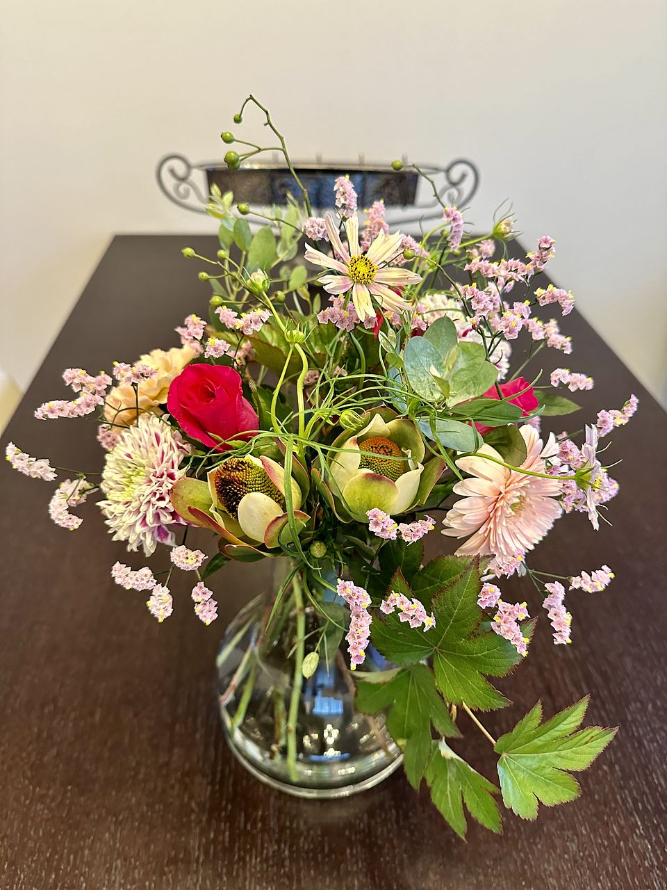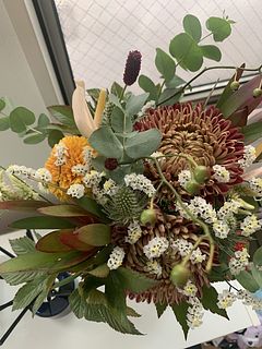 おまかせなので仕方ありませが、先に購入していたお彼岸ブーケと花材が重複していて(マム2輪と羽毛ケイトウ)、似たような雰囲気だったのが残念でした。 でも全体的にはセンスいいブーケだと思います💐